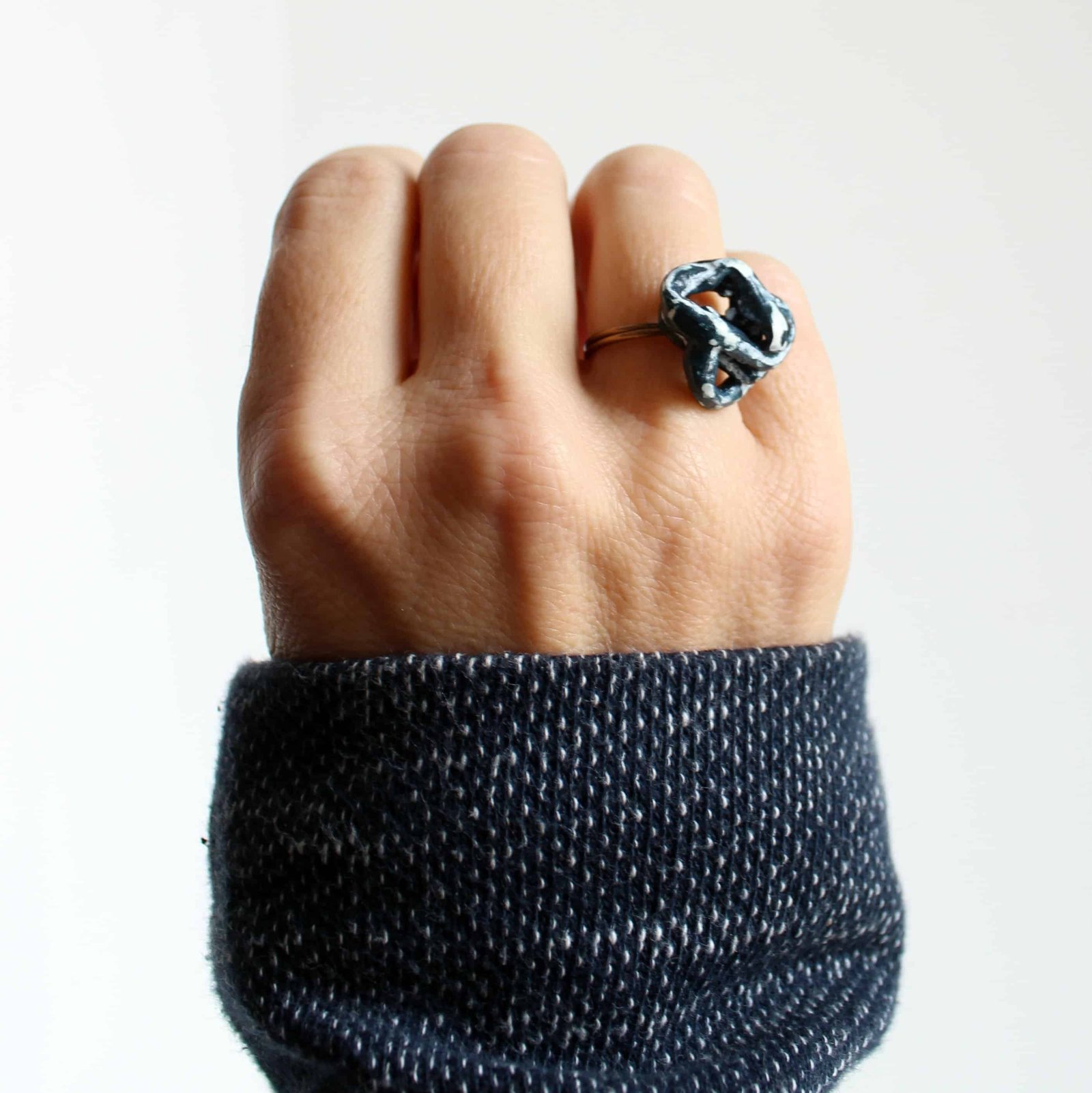 Gebrauchtes Seidenpapier, ein Metalldraht und eine Kreidebeschichtung bilden die Grundelemente für meine Ringe, Ohrringe und Halsketten in schlichten, natürlich gerundeten Formen.