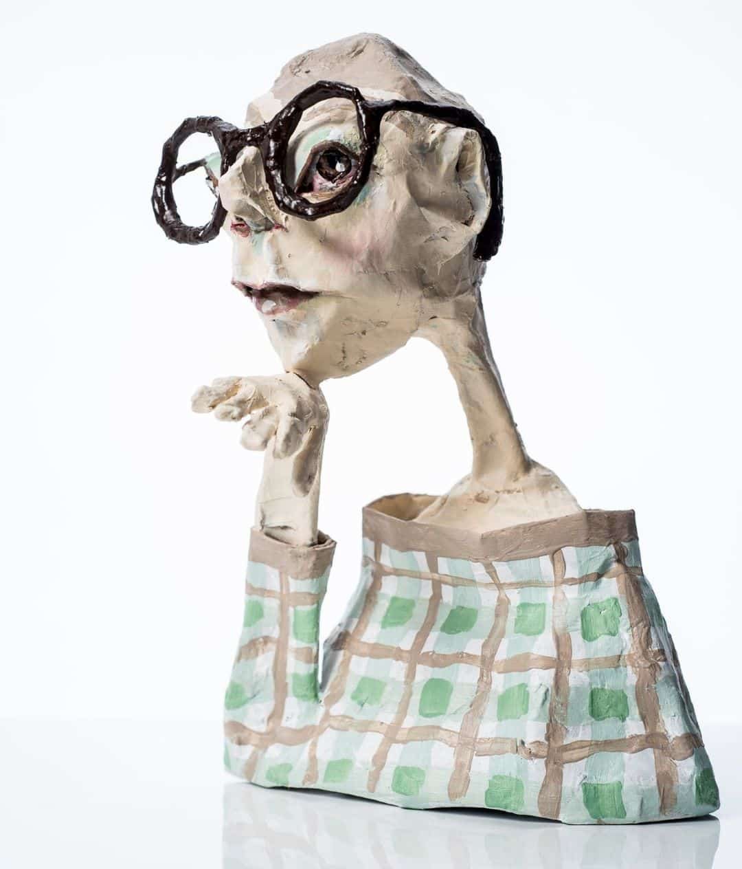 Après avoir étudié le graphisme à Kolding, Else Frøsig a travaillé pendant 25 ans comme directrice artistique chez Ogilvy & Mather à Aarhus avant de devenir artiste indépendante et de s’installer à Sonderborg. La technique de ses sculptures en papier s’inspire des créatures mythiques mexicaines appelées « alebrijes ». À l’aide d’un solide fil de fer, elle forme un squelette autour duquel s’enroule le papier. Couche par couche, il prend forme. Contrairement à beaucoup d’autres œuvres en papier mâché, elle ne cherche pas à faire disparaître la matière de ses figures en la ponçant, l’arrondissant par un remplissage ou un enduit : ainsi, par exemple, ces nez typiques et extrêmement fins sont créés par simple pliage, les oreilles ressemblent à des trous pointus (qui me rappellent le capitaine Spock à un certain point 🙂 ), et les doigts permettent d’entrevoir le fil de fer qui se trouve en dessous. Non, elle fait référence au matériau utilisé – le papier – et c’est ce qui rend ses sculptures si passionnantes : elles ne veulent pas imiter, elles se plaisent dans leur différence.