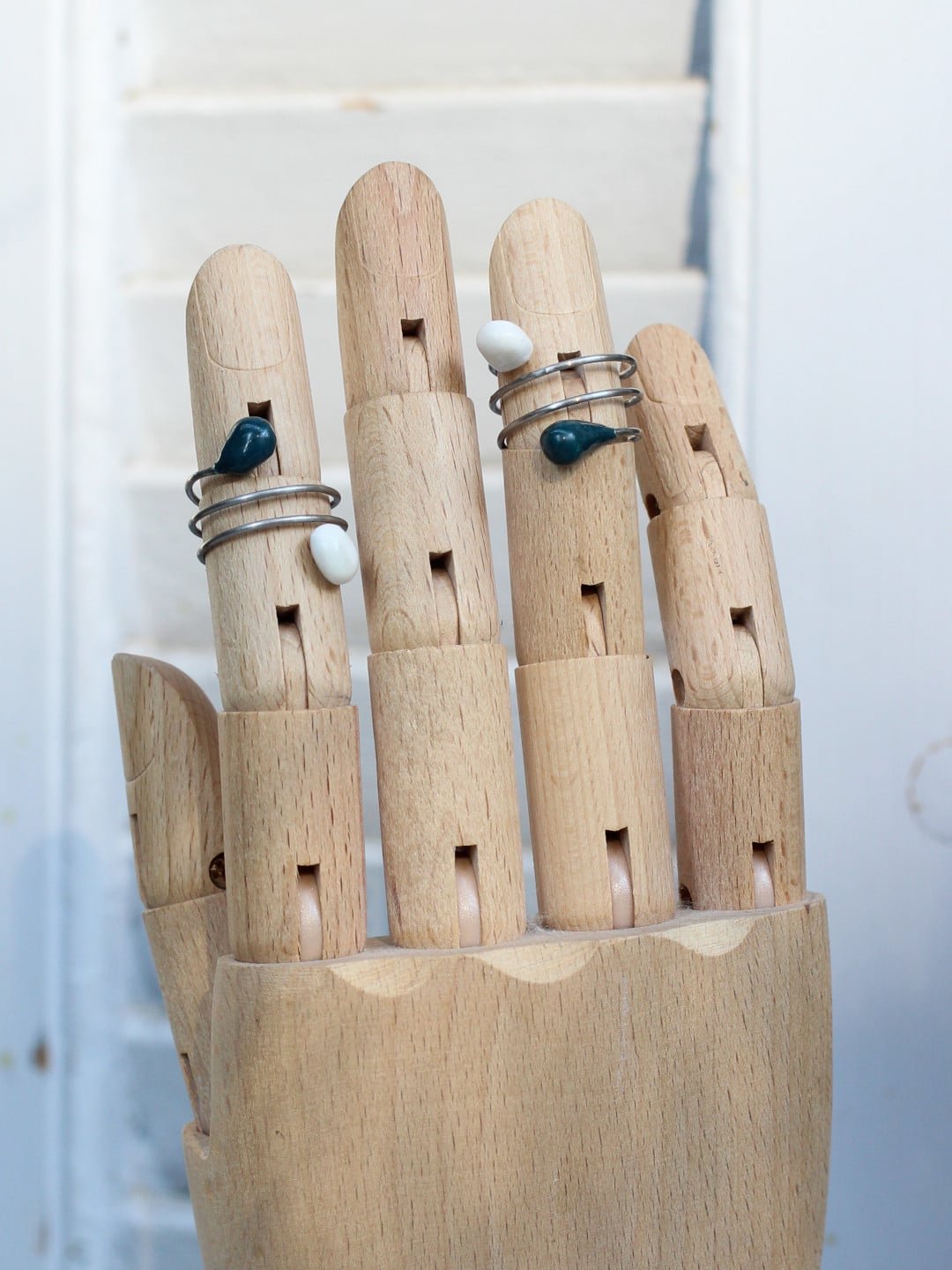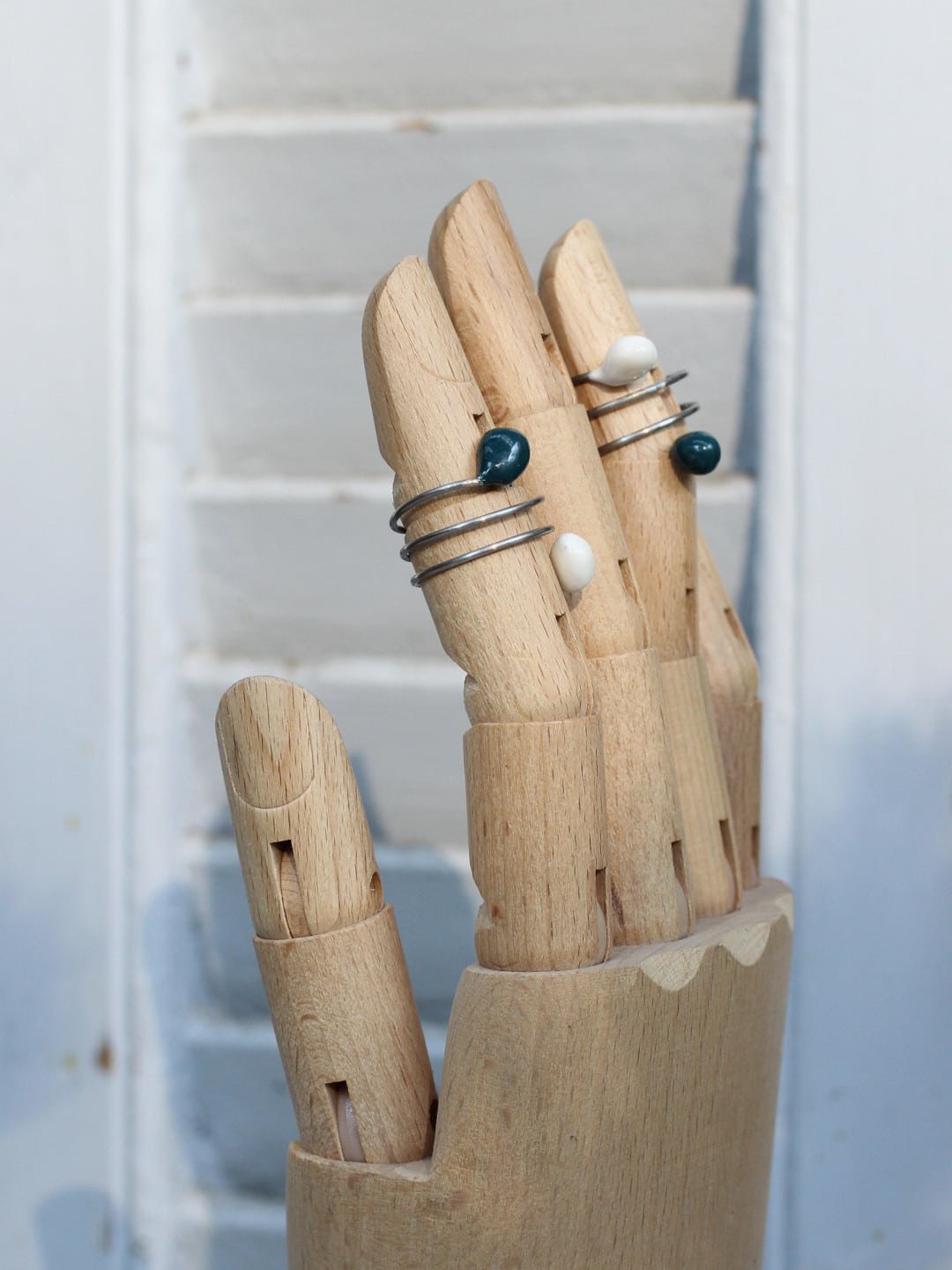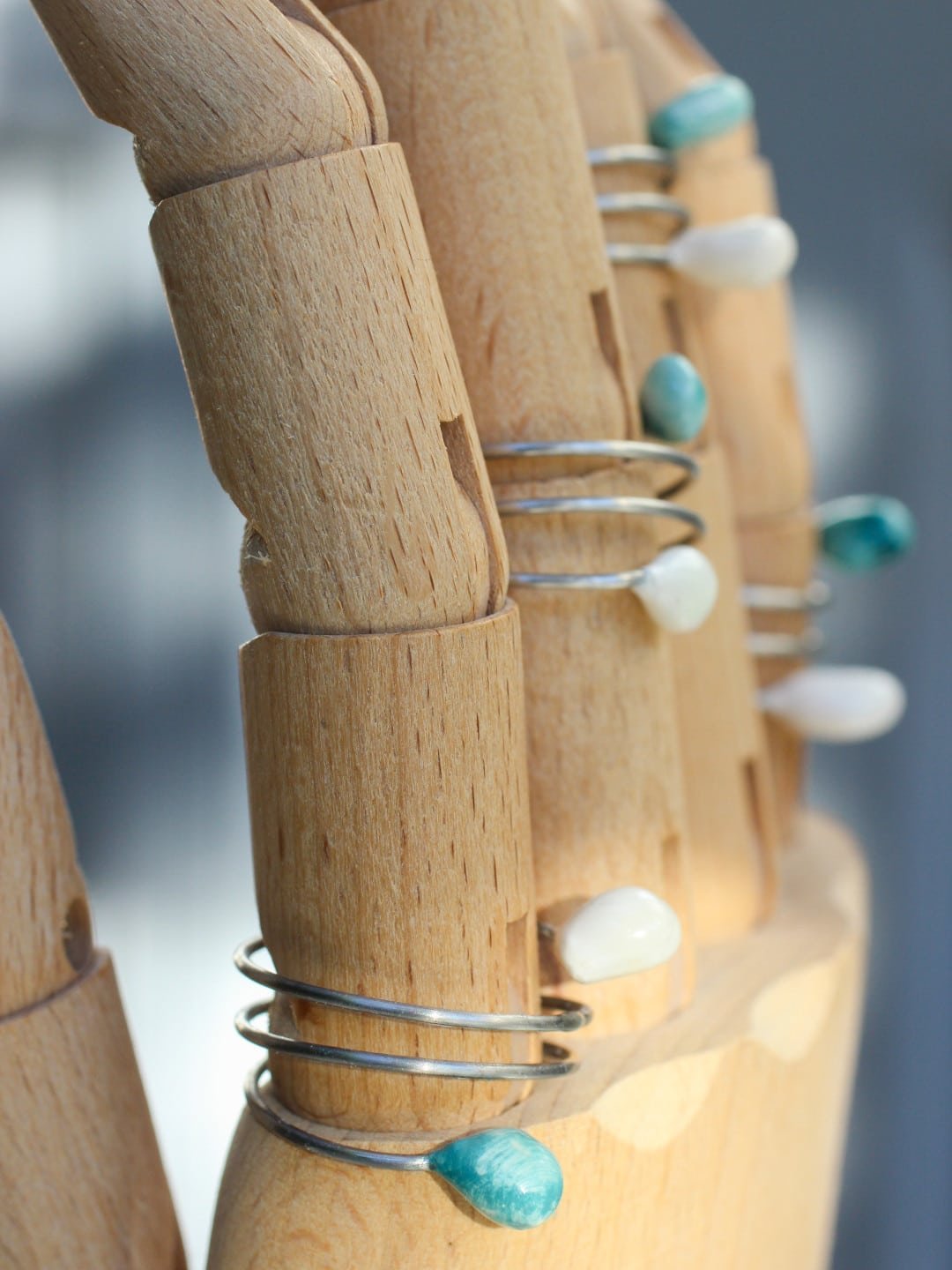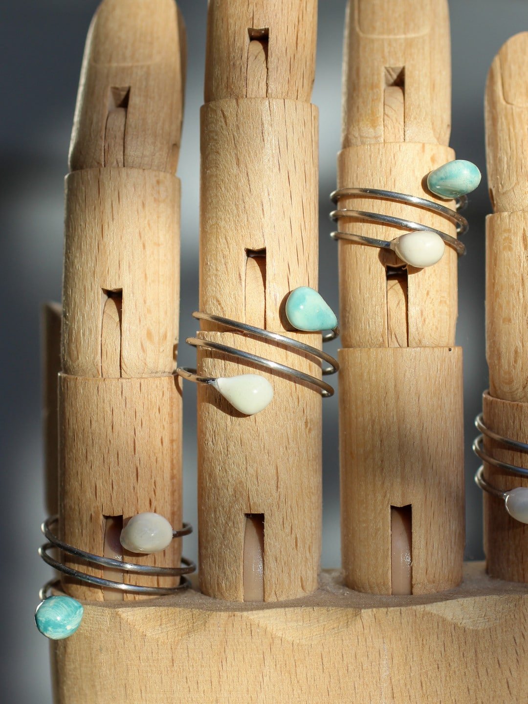 Chaque bague est réalisée dans mon atelier selon un processus minutieux s’étalant sur plusieurs jours, ponctué de temps de séchage, pour garantir solidité et esthétique. De petites irrégularités issues du façonnage à la main font tout leur charme : ainsi, chaque pièce est unique et ne sera jamais reproduite à l’identique.