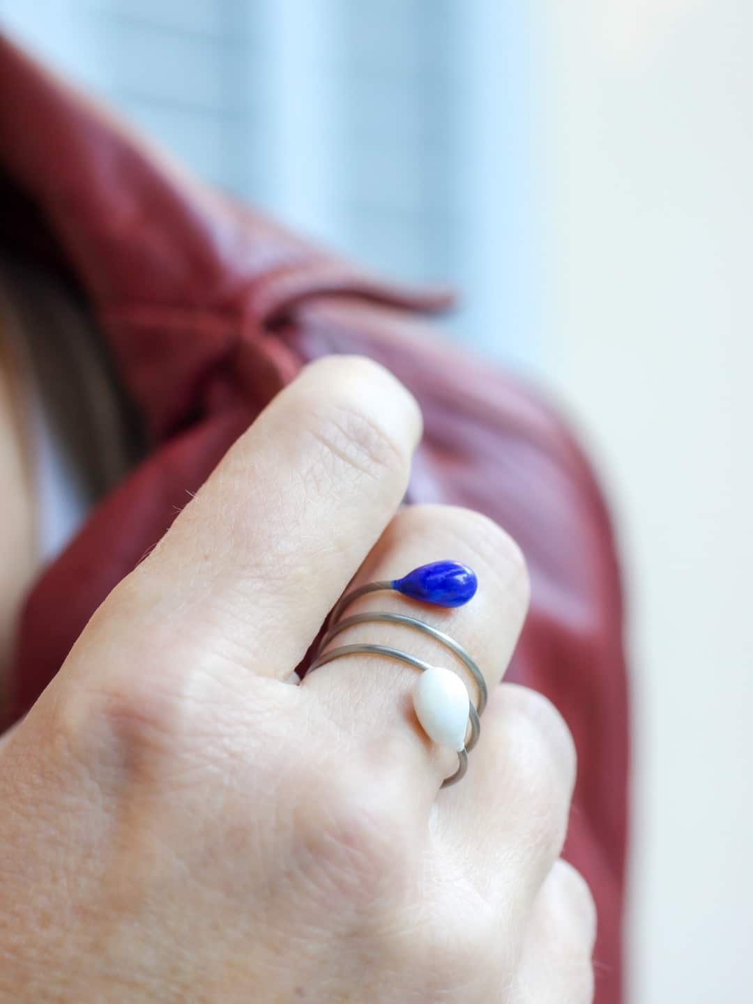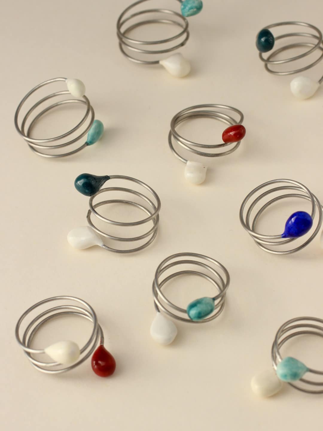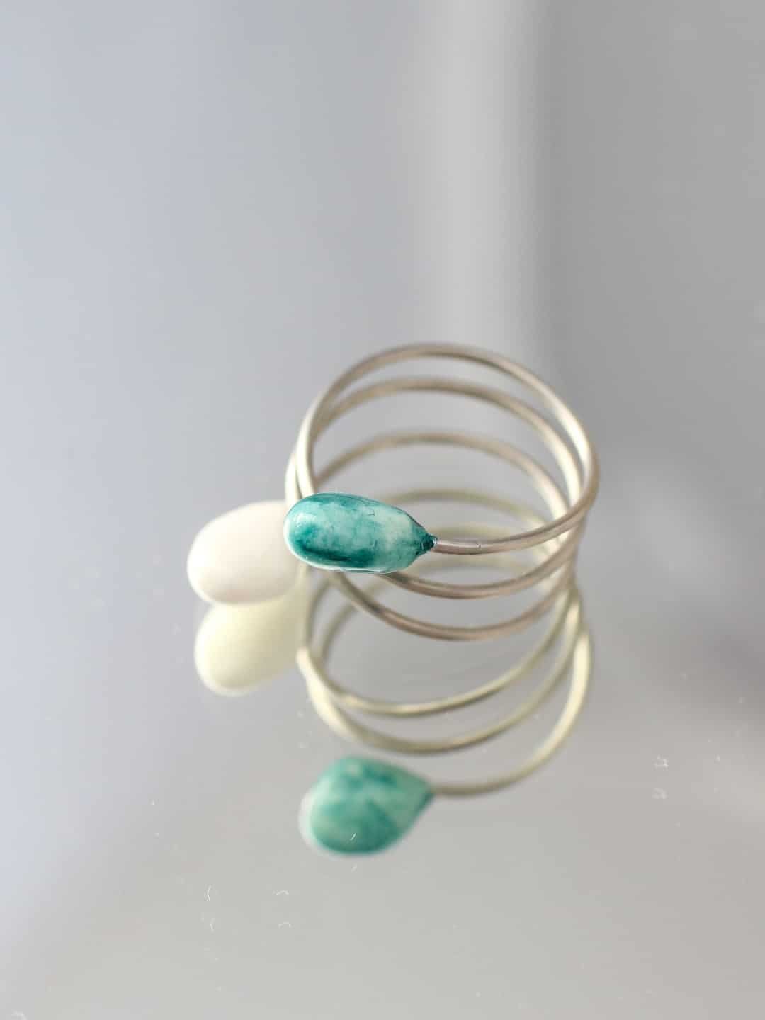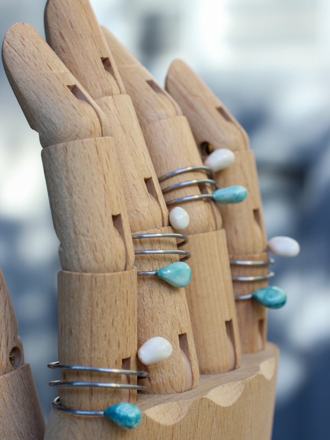 Chaque bague est réalisée dans mon atelier selon un processus minutieux s’étalant sur plusieurs jours, ponctué de temps de séchage, pour garantir solidité et esthétique. De petites irrégularités issues du façonnage à la main font tout leur charme : ainsi, chaque pièce est unique et ne sera jamais reproduite à l’identique.